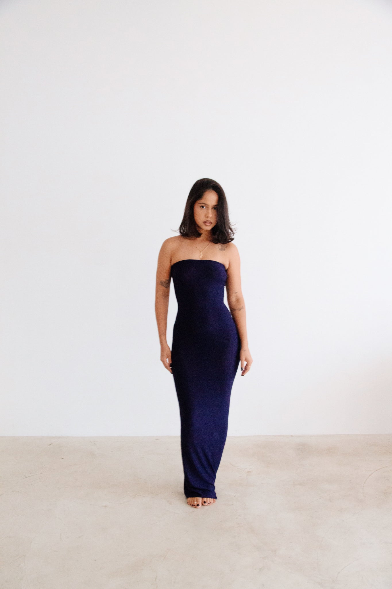 strapless bamboo jersey maxi-length in navy. raw edge at bottom hem.