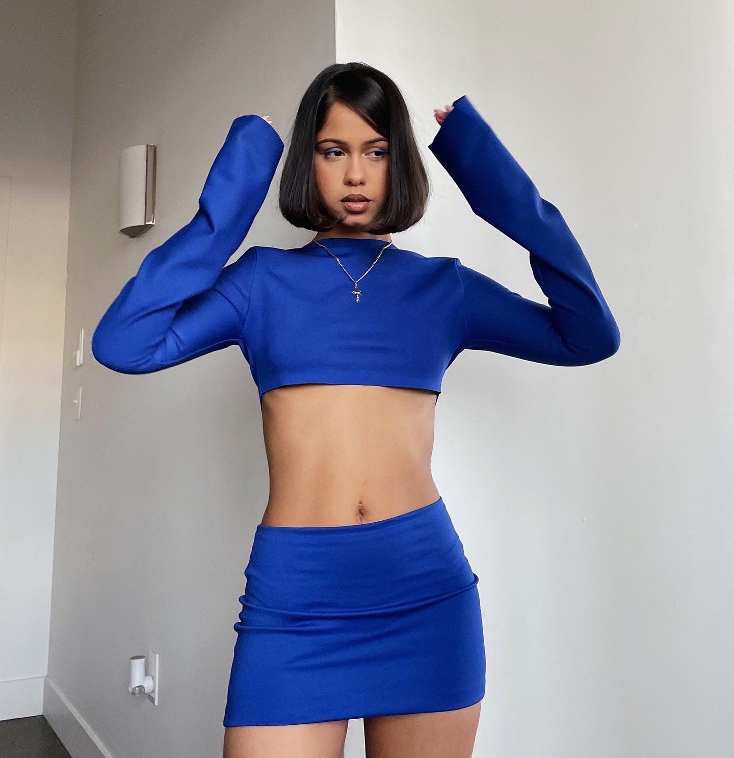 cropped top with oversized sleeves in royal blue. raw edge at neck and bottom hems.