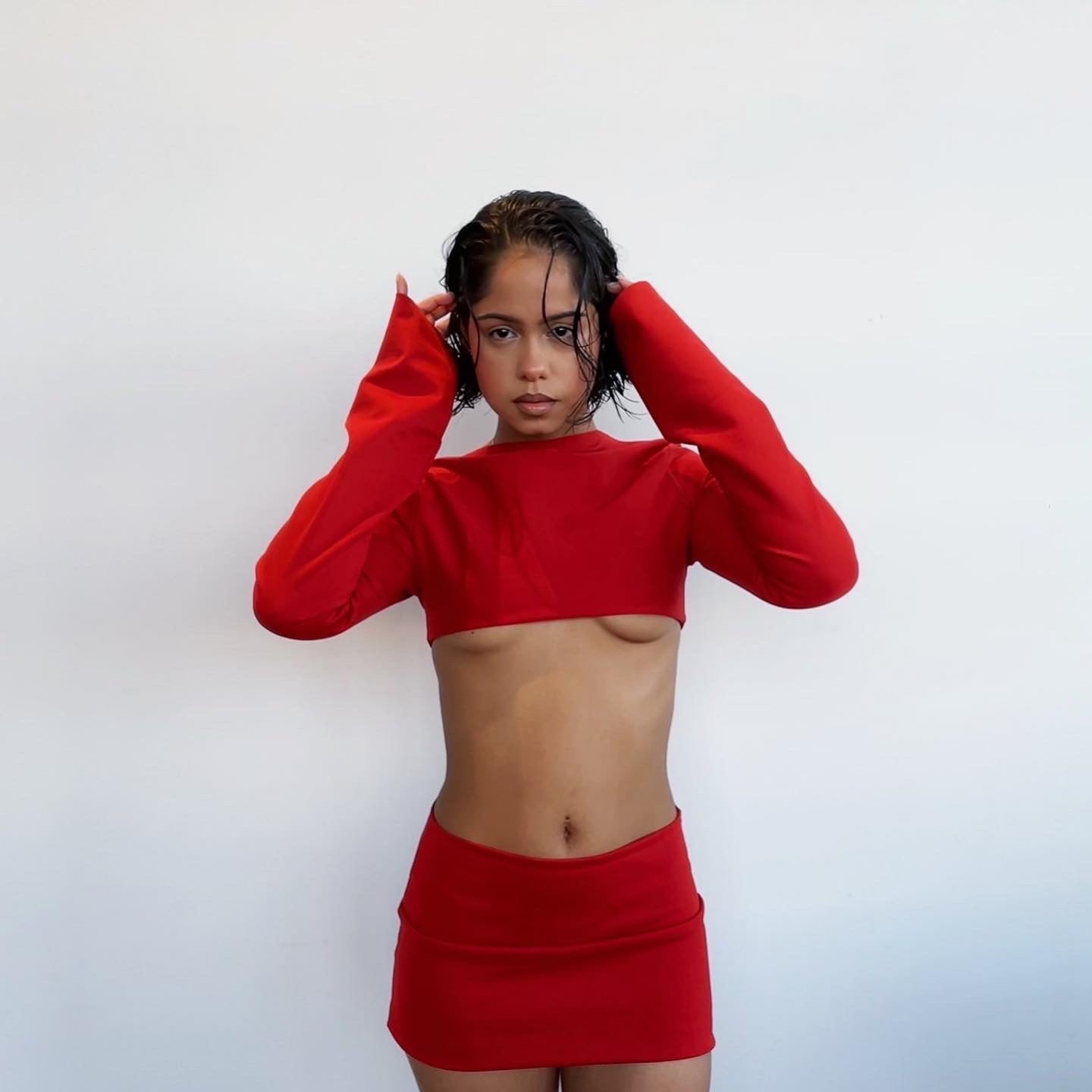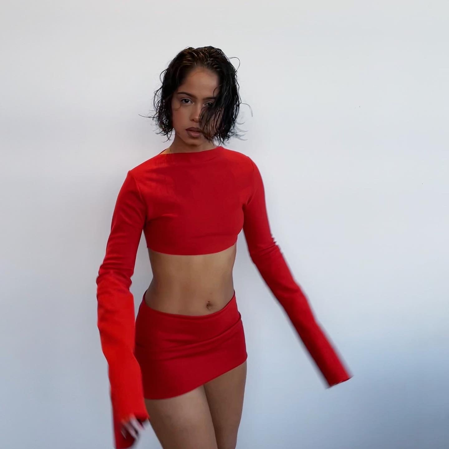 cropped top with oversized sleeves in rust. raw edge at neck and bottom hems.