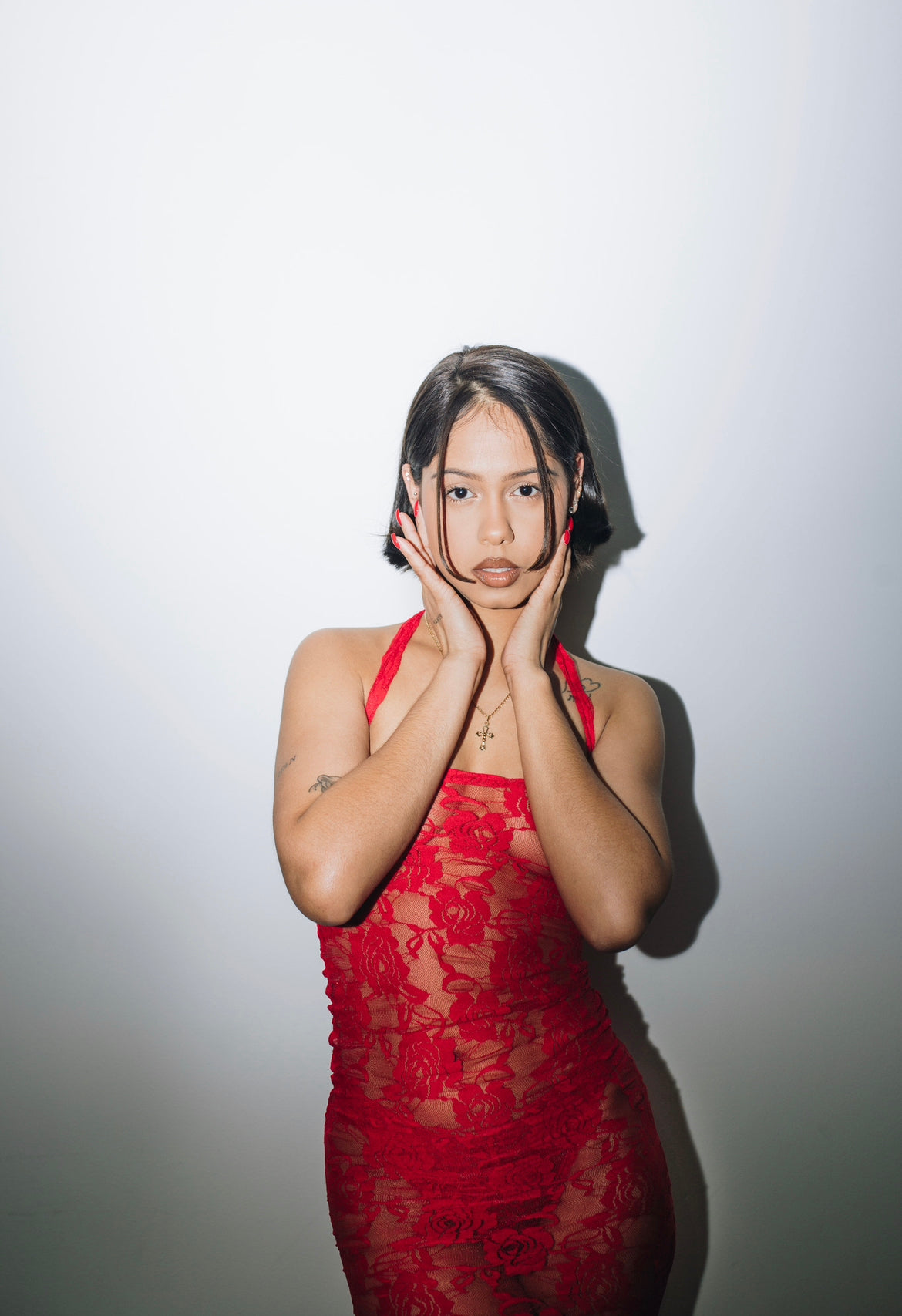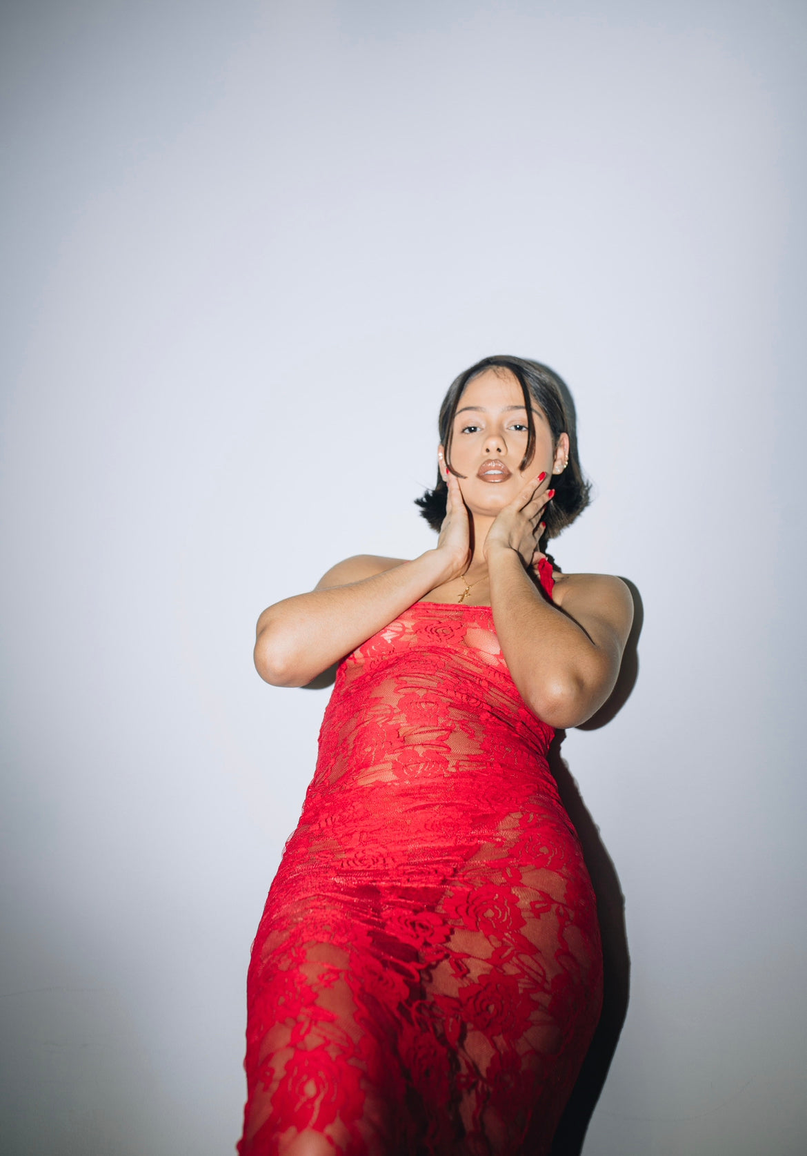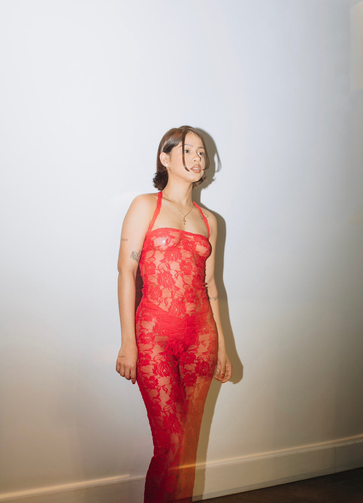 double strap floral lace lingerie dress in rose red. raw edge at bottom hem.