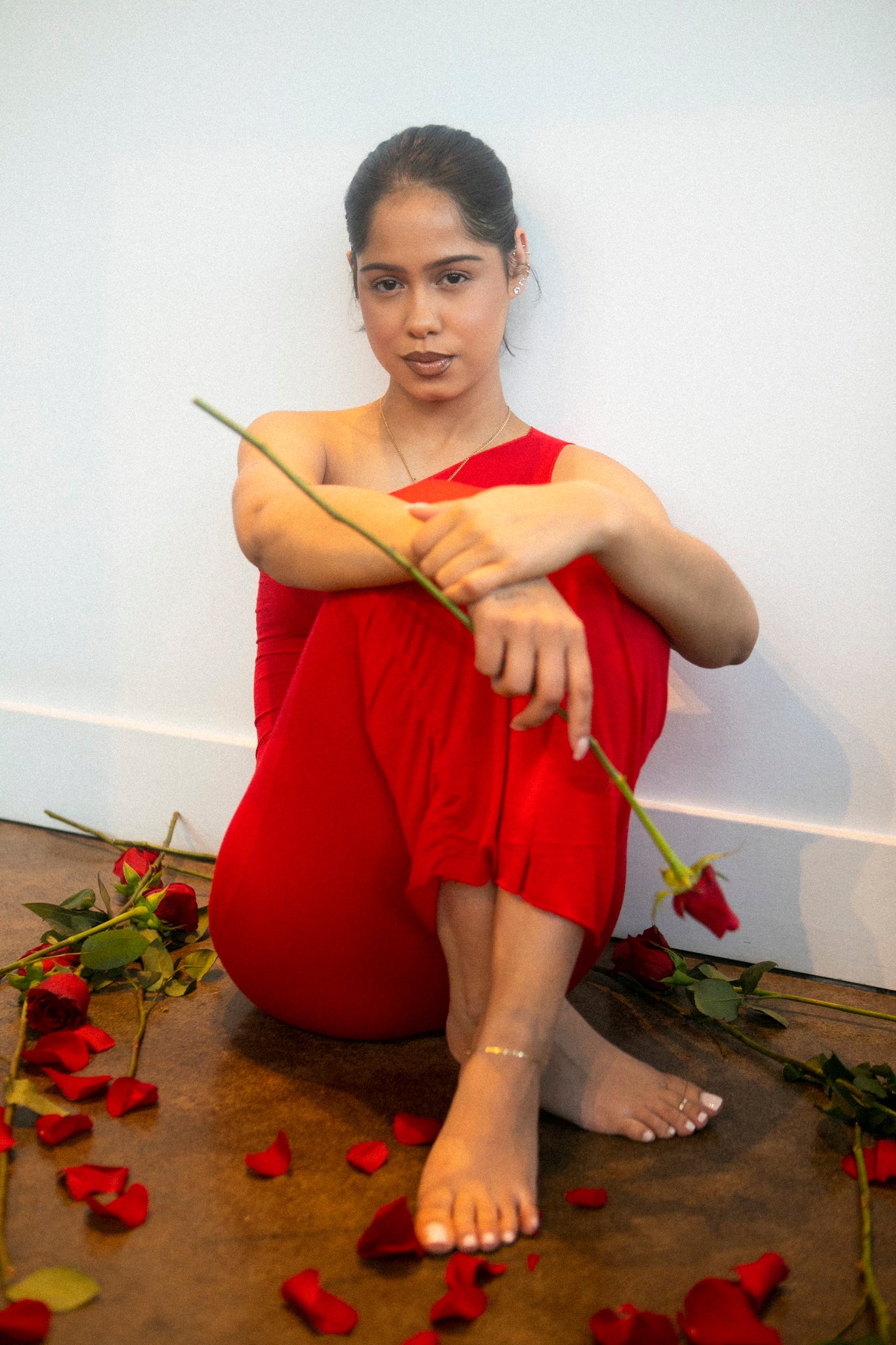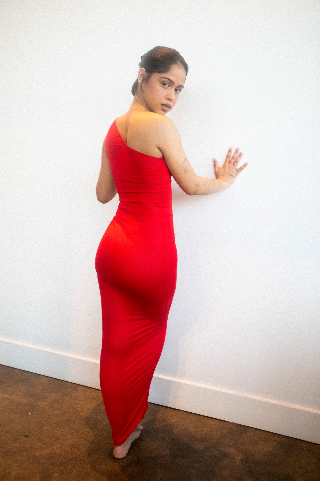 single-shoulder promodal semi sheer knit maxi-length in Red. raw edge at hems.