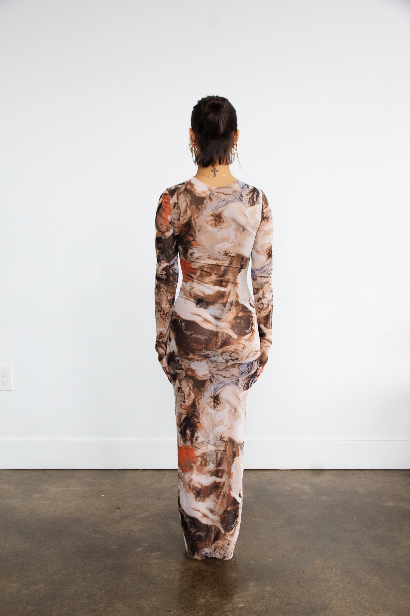 long sleeve stretch mesh maxi-length in angels print. raw edge at hems.