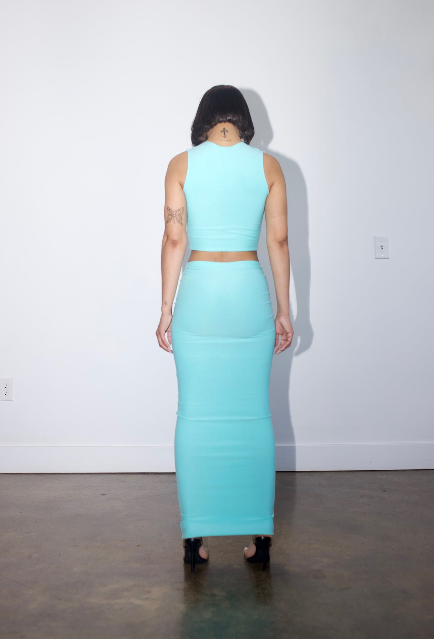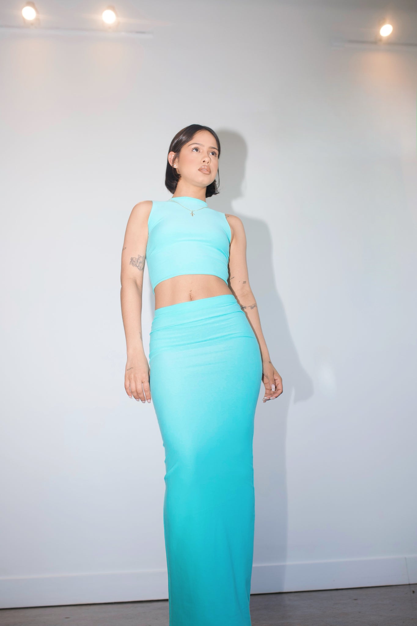 maxi-length skirt in aqua. raw edge at bottom hem.