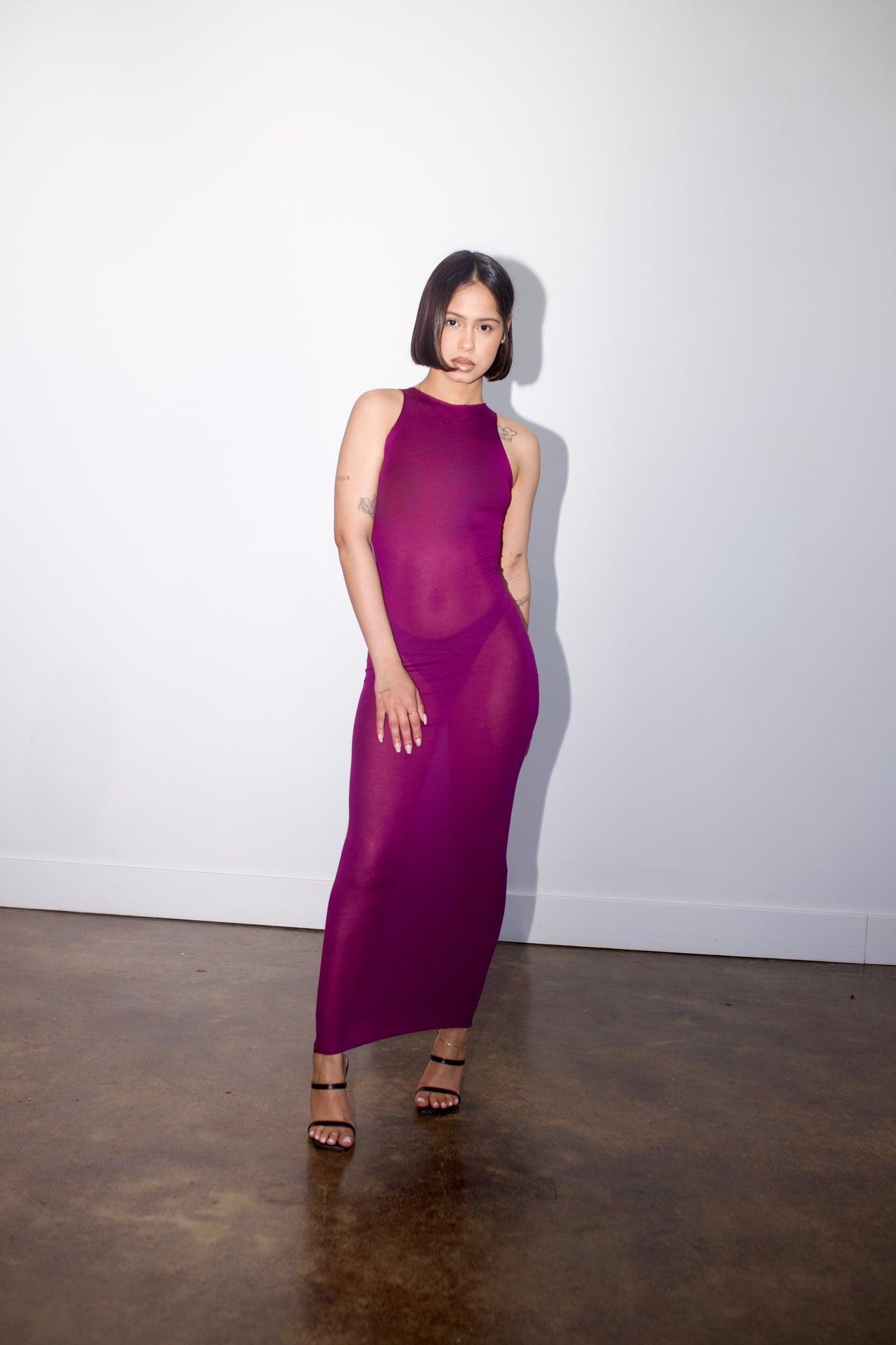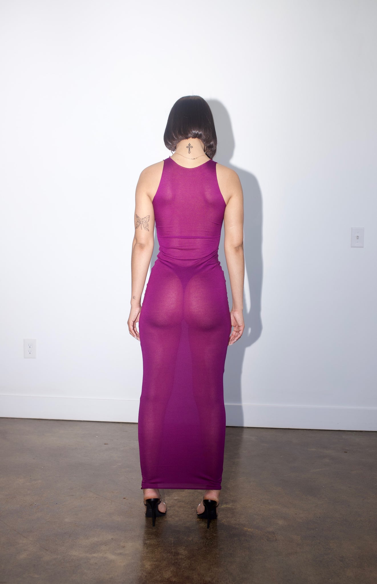 tank modal silk semi sheer maxi-length in purple. raw edge at hems.