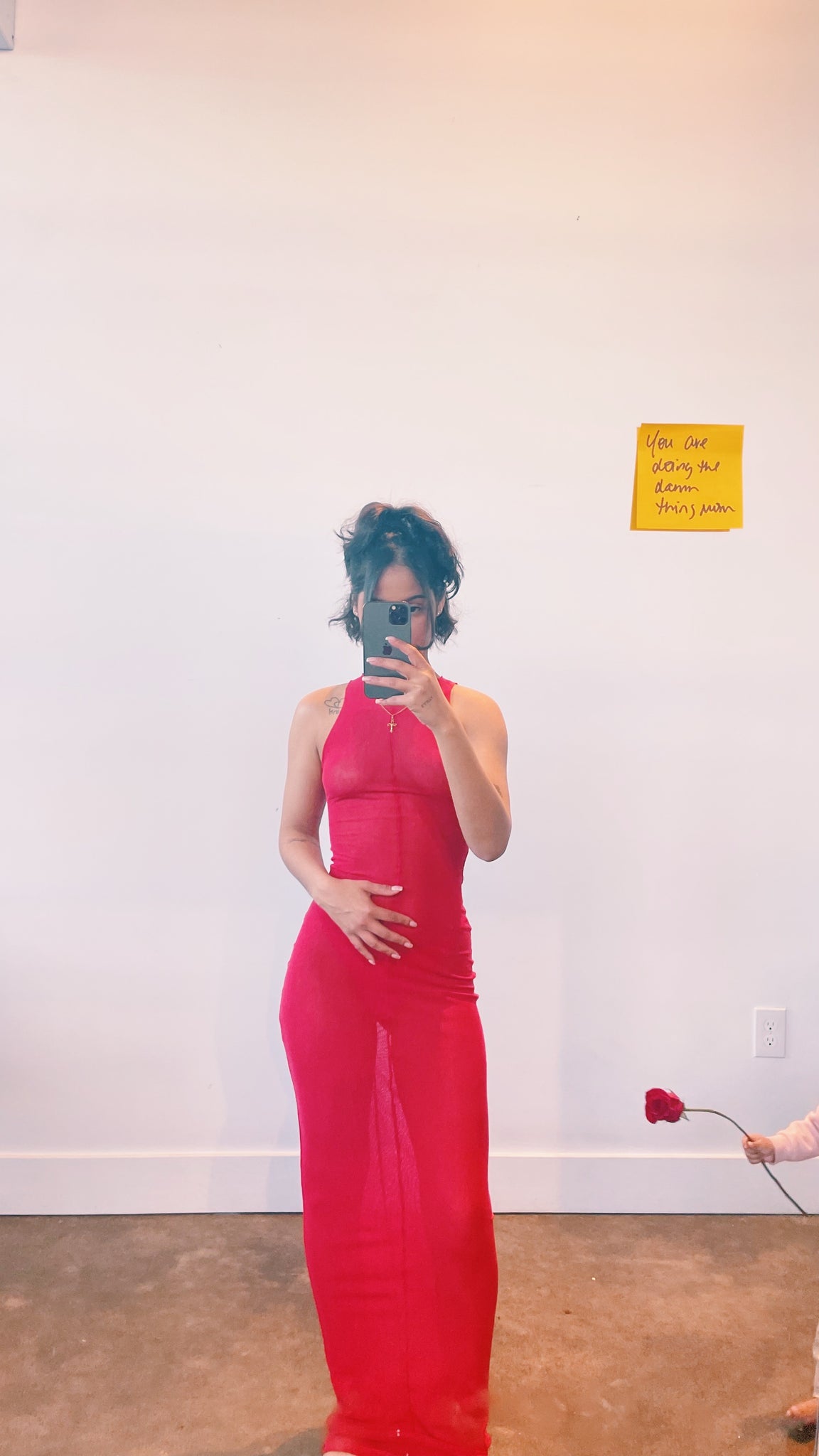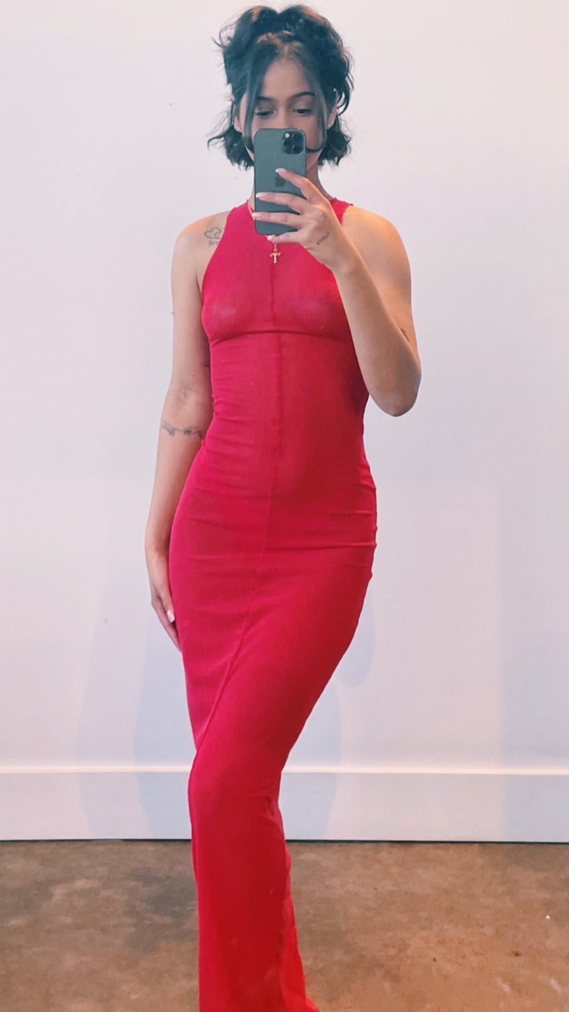 tank stretch mesh maxi-length in Red. raw edge at hems.